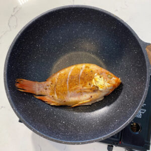 - Marble coating both inside and outside makes cleaning this pan easily