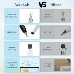 - 【Wide Compatibility】: Accokids stylus is universally compatible with all capacitive screen cell phones, tablets, touch screen laptops and PC, e-readers, such as iPhone, iPad Pro, Apple Watch, Samsung Galaxy,HUAWEl, Lenovo, Motrorola, Tablet, Laptop,Microsoft Surface.
